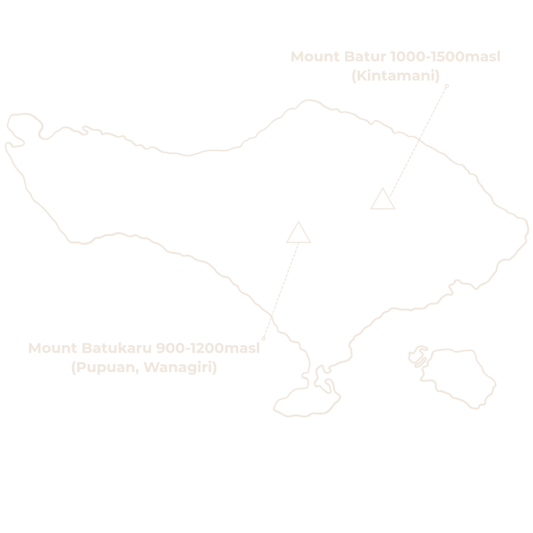 Mitra-mitra kopi utama kami berada di Bali dan mereka menanam kopi di sekitar Gunung Batukaru dan Gunung Batur. Musim panen kopi berlangsung sekitar dari Februari hinggi Juli. Semua mitra kami adalah petani organik. Kami mengkategorikan mereka ke dalam beberapa wilayah penanaman.